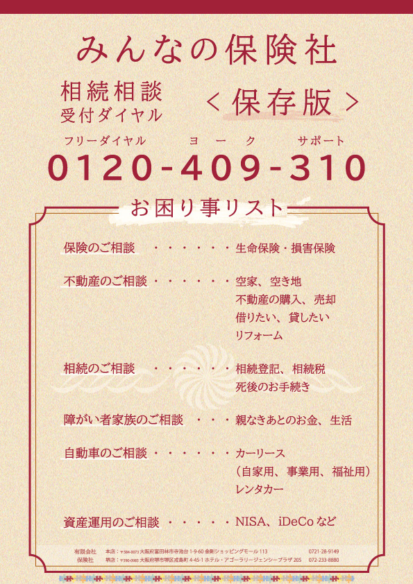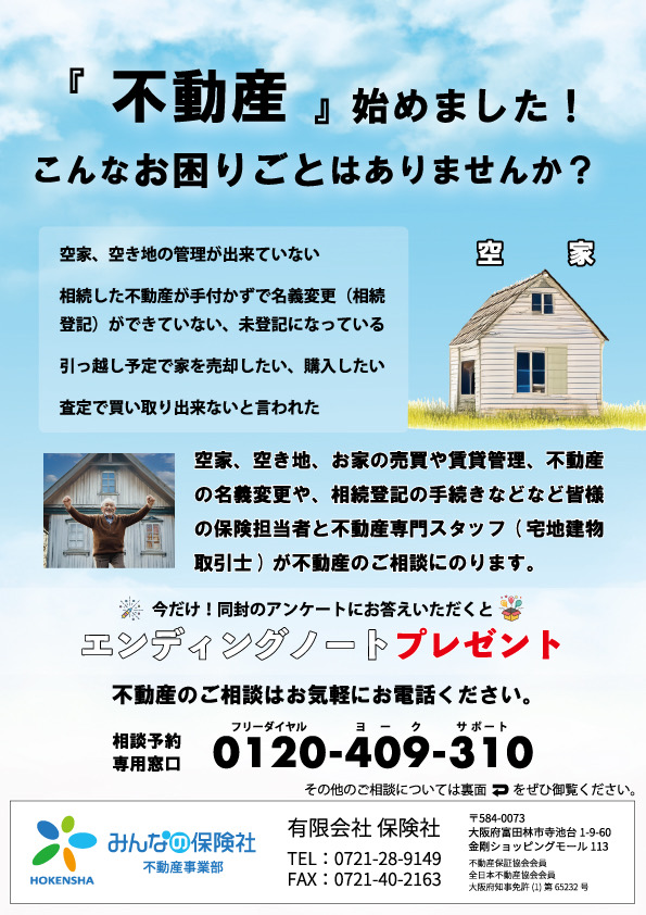 2024-09-01 / 最終更新日時 : 2025-03-03 adachi お知らせ 相続専門の不動産相談を開始しました! グループ会社の「みんなの保険社」が、不動産免許を取得し 相続専門の不動産相談を開始しました。 特に空き家問題や空き地に力を入れております。 担当は神元宅建士が担当しております。 お悩みの方はいつでもお気軽にご相談ください。