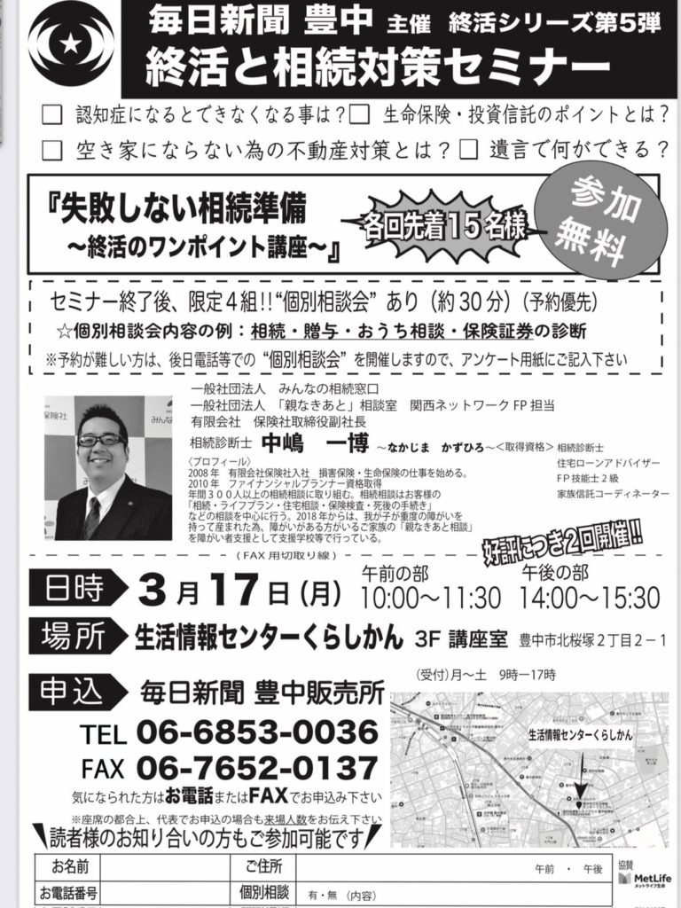 3月17日毎日新聞豊中様主催で、終活と相続対策セミナーを行いました。
