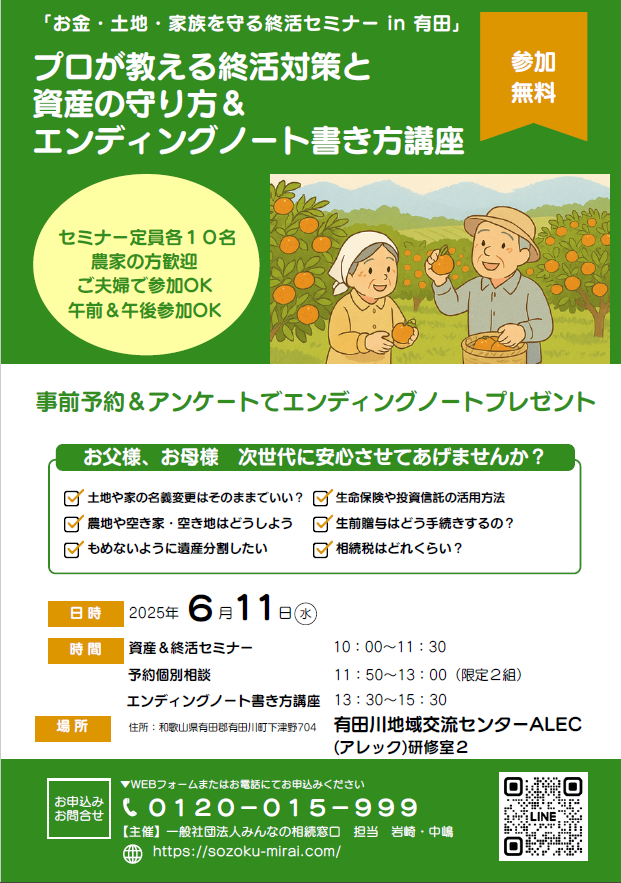 和歌山県有田市にて、終活や資産の守り方、エンディングノートの書き方に関するセミナーを開催します。