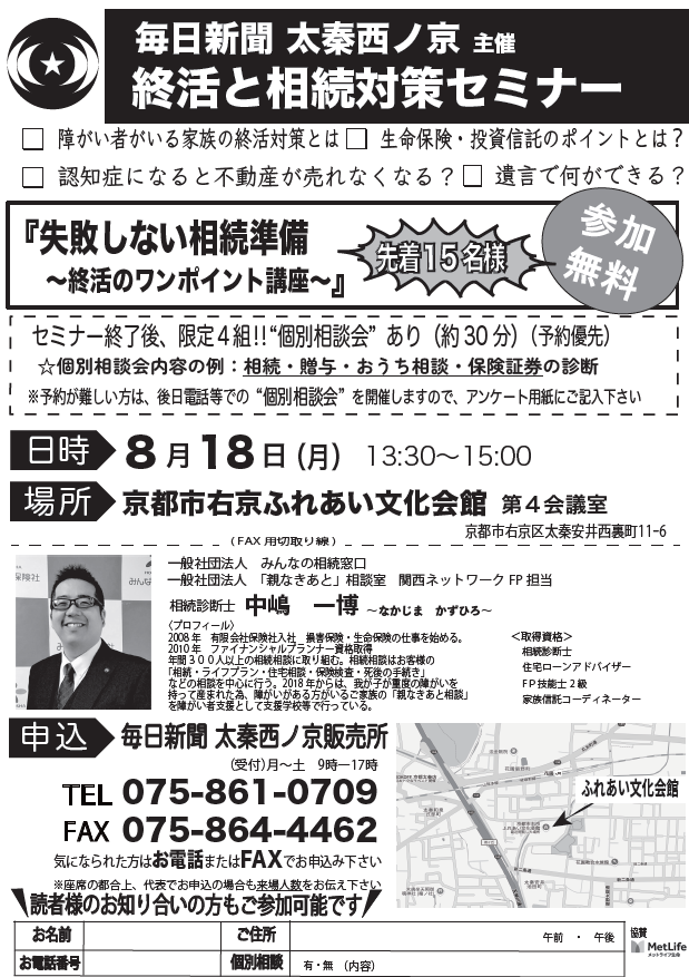 【予告】8月18日 終活と相続対策セミナー in 京都市